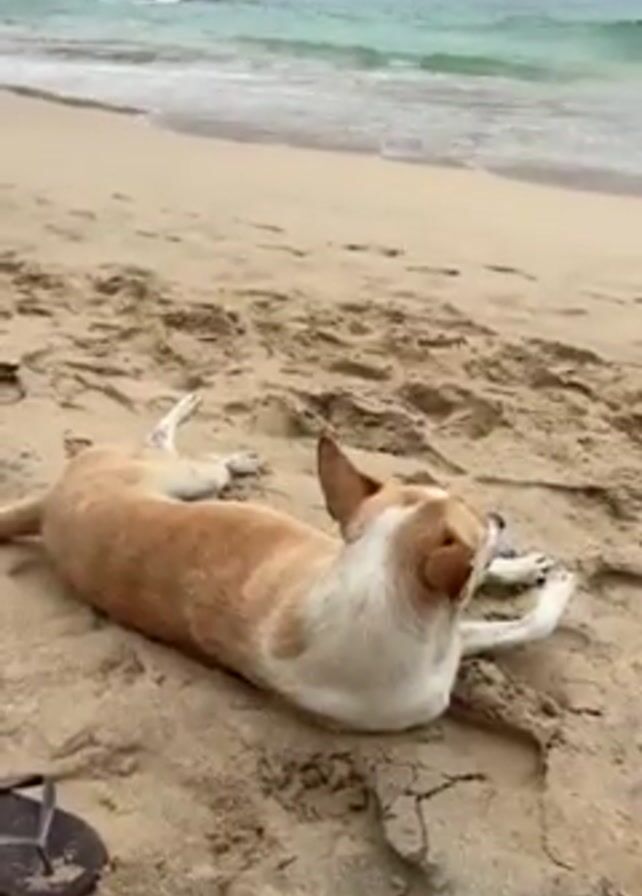dog lying on a sandy beach near the ocean. The dog has a white chest and face, with brown patches on its body. It is lying on its side with its legs outstretched and eyes closed. A pair of flip-flops sits on the sand to the left of the dog. In the background, the ocean waves roll onto the shore, and a green, tree-covered area can be seen along the coast. The sky is overcast.