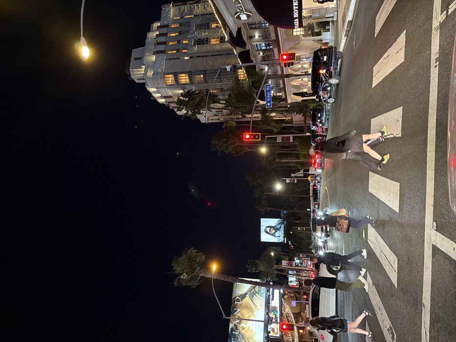 The image presents a nocturnal urban street scene in West Hollywood, Los Angeles, United States of America, specifically at the intersection of Sunset Boulevard and Kings Road. The sky is dark, with ambient illumination provided by various artificial light sources. In the foreground, a multi-lane asphalt roadway features a prominent white-striped pedestrian crosswalk. Approximately seven individuals are actively traversing this crosswalk from left to right. From left to right, the pedestrians are detailed as: a female in a dark top and short skirt; a male in a light-colored top and dark pants; a male in a dark jacket and dark pants; a female in a dark hoodie with a patterned bag over her shoulder; followed by two males, one in a dark jacket and pants, and another in a dark jacket, dark shorts, and bright yellow-striped sneakers. All visible pedestrians are in mid-stride. Vehicle traffic is observed on the street. A line of cars and SUVs is stopped in the midground at a red traffic light, with headlights and taillights illuminated. Additional vehicles are visible further down the street. The right side of the frame features a large, multi-story, light-colored building (The London West Hollywood) characterized by its Art Deco architecture, including numerous illuminated windows and decorative facades. Below it, street-level establishments are visible, one with a dark awning partially displaying "PLAZA HOTEL." A blue street sign indicating "<- Kings Rd" is mounted on a pole near this building. A red traffic light is prominently displayed on the far right. The left side of the image displays large billboards. One billboard features an advertisement for "ATLANTIS" (likely "Aquaman and the Lost Kingdom"), while another billboard showcases an image of a person wearing sunglasses and a hoodie. Numerous tall palm trees are distributed throughout the scene, interspersed among buildings and alongside the roadway. Multiple streetlights emit a warm yellow glow, illuminating the environment. Another red traffic light is visible on the far left.