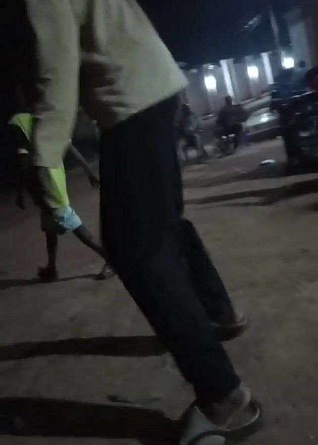 person standing outdoors at night. The person is wearing a light-colored long-sleeved shirt, dark pants, and sandals. The person in the foreground appears to be swaying or moving erratically. In the background, several people are sitting on chairs. There are also vehicles and buildings visible in the background, illuminated by streetlights. The lighting is poor, and the overall scene appears blurry due to movement. Another person in a dark t-shirt stands next to the first person, partially blocking the view.