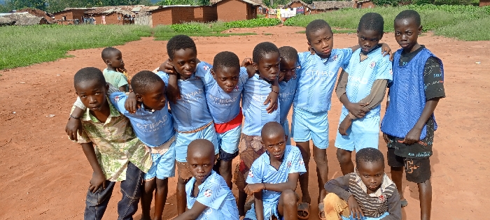 A group of children, mostly boys, are gathered outside, many wearing light blue soccer jerseys with "ETIHAD" printed on them. Some are standing with their arms around each other. One boy wears a blue vest over a black patterned shirt, and another is dressed in a patterned shirt and jeans. There are rural dwellings in the background. The ground appears to be red dirt.