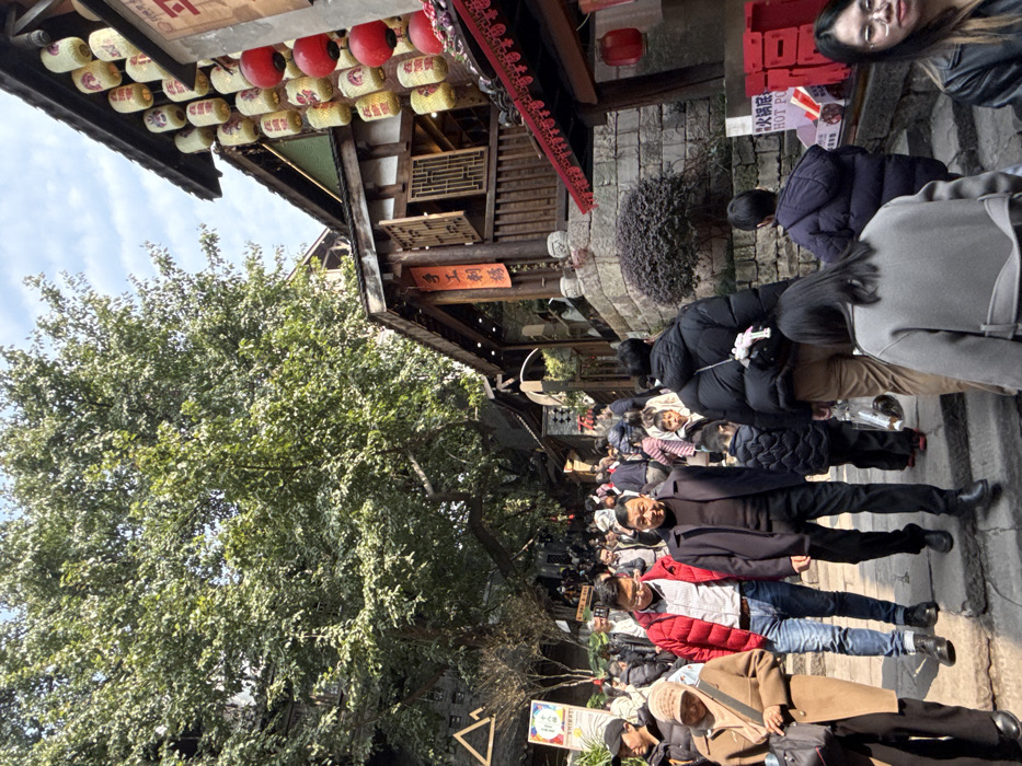 A busy street scene with many people walking. The buildings have traditional Chinese architectural features, including lanterns and wooden structures. A large tree is on the left side of the frame. The sky is visible in the upper left corner, suggesting a sunny day. The photo is slightly tilted.