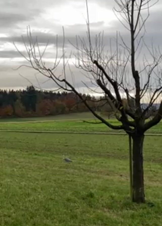 A video shows a field on a cloudy day with a bare tree in the foreground, supported by a wooden stake. A gray bird walks on the green grass near the tree. In the background, a forest and rolling hills are visible.