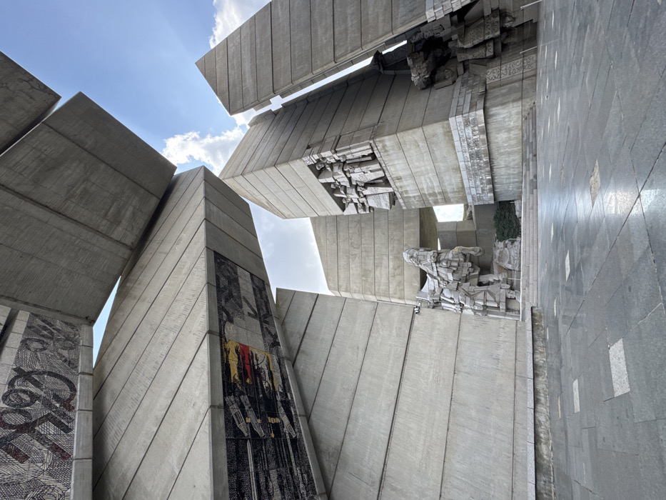The image displays the Monument to 1300 Years of Bulgaria, located in Shumen, Bulgaria. The scene is dominated by massive, angular concrete structures composed of large, grey blocks. These blocks exhibit visible formwork lines, often diagonally oriented. Integrated into the concrete surfaces are extensive, multi-colored mosaics featuring abstract patterns, geometric shapes, and fragmented figures, with dark backgrounds punctuated by areas of red and yellow. In the mid-ground, a prominent, blocky equestrian statue, constructed from segmented concrete, stands. Adjacent concrete walls feature multiple large-scale bas-reliefs depicting stylized human figures. One relief shows several figures arranged vertically, while a lower section presents more abstract or partially obscured human forms. The ground area is a plaza paved with dark, reflective rectangular and square stone tiles. The sky above is partly cloudy, with patches of blue visible between the towering concrete elements. Sparse dark green shrubbery is visible at the base of some monument sections. No individuals are present, and no actions or interactions are depicted within the frame.