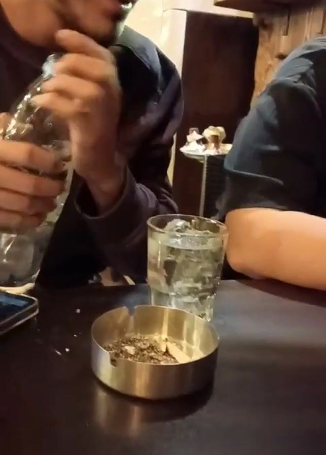 A dimly lit scene shows a young man seated at a table, pouring a clear liquid from a glass bottle into a glass filled with ice. He is wearing a black sweater and has a trimmed beard. To his right, another person is partially visible, wearing a black shirt. On the table, there is a silver ashtray filled with cigarette butts, a glass of ice water, and a smartphone. The man pours the liquid into the glass, then he stops and looks to his right.