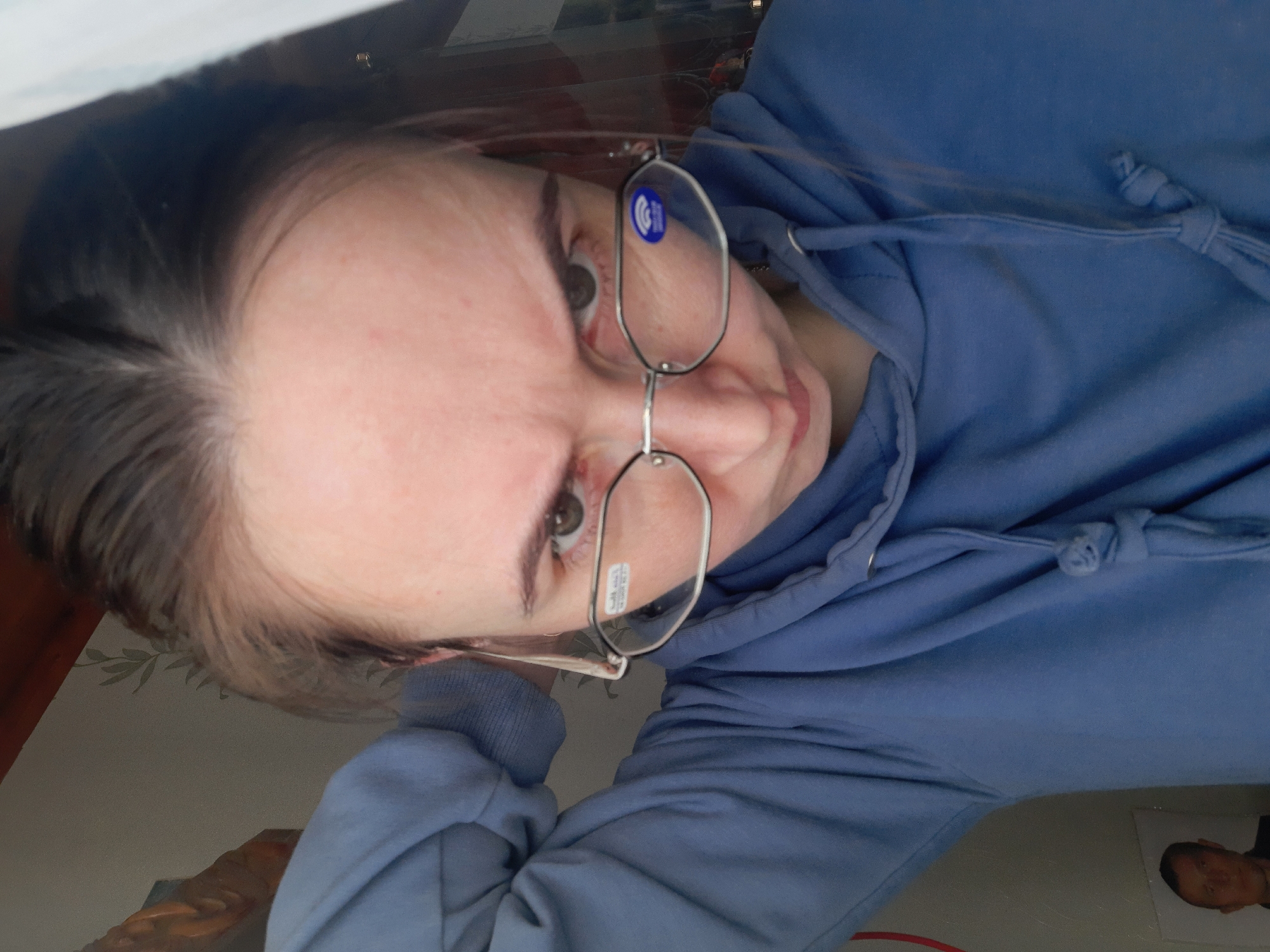 A close-up, slightly low-angle photograph taken indoors in Архангельское, Russia, depicts an adult individual, identified as female, with dark brown hair styled away from her face. She is wearing a blue hooded sweatshirt with a visible drawstring. Her brown eyes are fixed directly on the camera, conveying a stern expression, emphasized by furrowed eyebrows. She wears silver-rimmed, possibly octagonal, eyeglasses; a blue circular sticker with a white symbol is affixed to the right lens (viewer's left). Her left arm (viewer's right) is raised, with the forearm bent and the hand out of frame. The background on the left (viewer's right) consists of a light-colored wall with faint green leaf-patterned wallpaper, a visible wooden structural element in the upper corner, a red cable running vertically, and a printed photograph of a male affixed to the lower portion of the wall. A narrow, vertical white structure is visible on the far right edge of the frame.