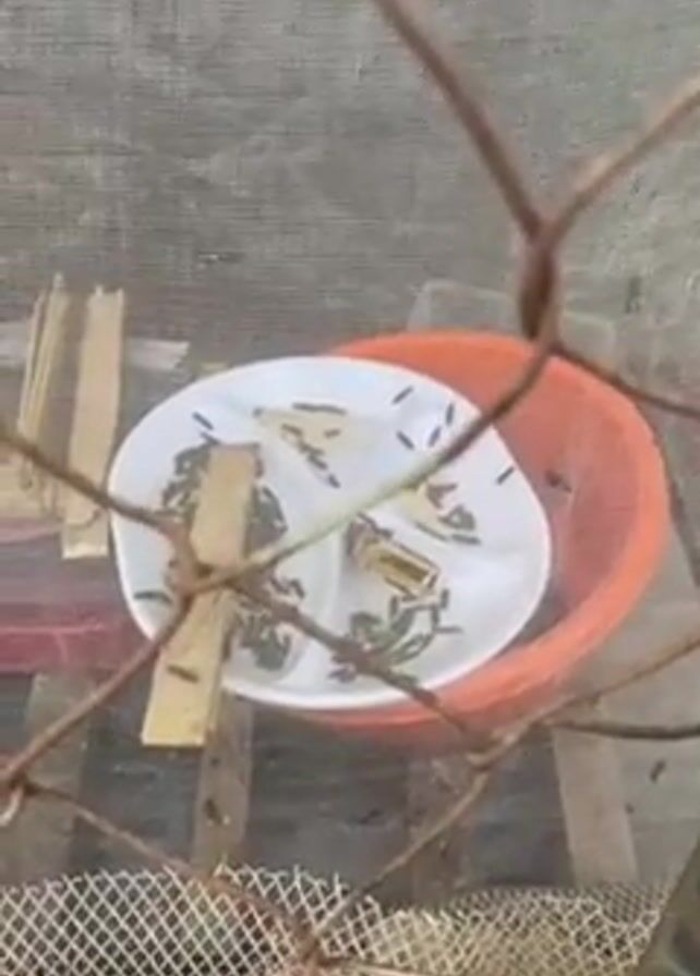 white, segmented plate placed inside an orange bowl. The plate contains several black insects crawling on some light-colored crumbs. The bowl and plate are located within a metal wire cage that is partially covered by a white, gauzy fabric. Some wooden sticks are placed next to the bowl. The camera moves upward, focusing on the wire cage and then the white fabric, briefly revealing more insects on the fabric.