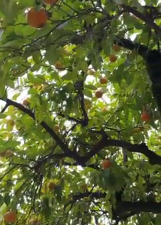 n orange tree with many ripe oranges hanging from its branches. The tree has dense green foliage, and the oranges are a bright orange color. The camera slowly pans upwards, providing a closer view of the fruit and leaves. The lighting suggests it might be a cloudy day. The environment appears to be urban, as parts of a building can be seen in the background.