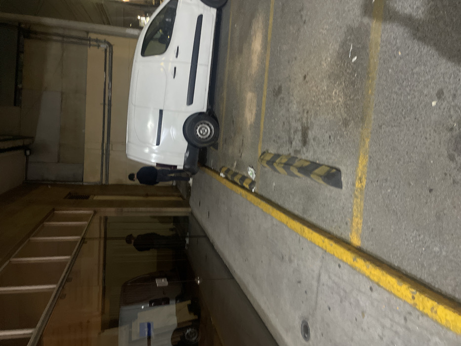 A white van is parked at an angle next to a curb with yellow and black safety posts. A person dressed in dark clothes stands near the rear wheel of the van. The scene is partially reflected on the glossy floor, showing a blurred image of the van and the person. The background consists of a building with pipes running along the wall.