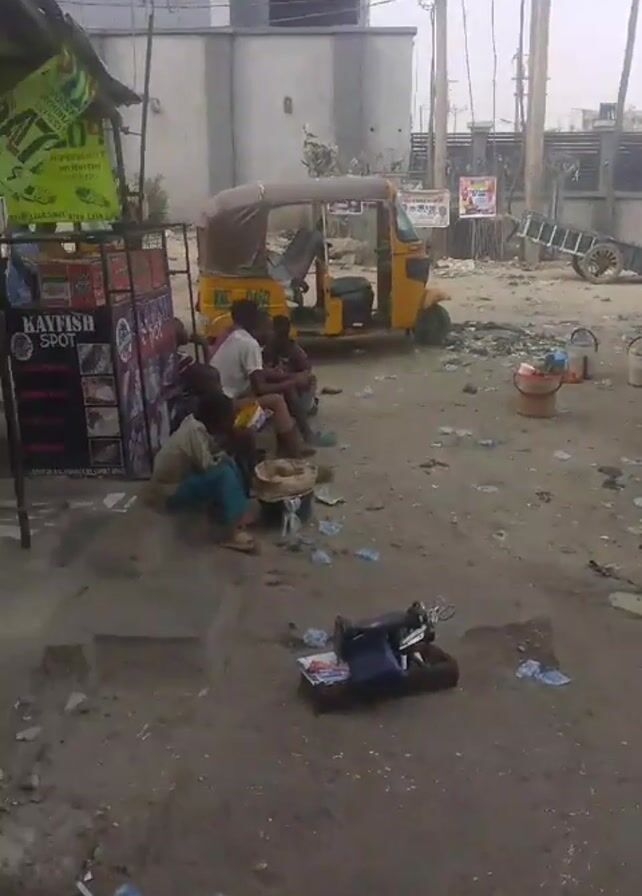 bustling scene in what appears to be a marketplace or public space in an urban area, possibly in Africa. The ground is unpaved and covered with trash and debris. Several people are present. Some are sitting, others are standing in groups, and some are actively engaged in transactions or moving through the space. A few auto-rickshaws (tuk-tuks) are parked or moving nearby. There are also carts loaded with jerrycans, possibly containing water or fuel. There is a sign for "Kayfish Spot" and a sign for "RCCG Trinity Parish." The overall atmosphere suggests a vibrant but somewhat chaotic commercial area.
