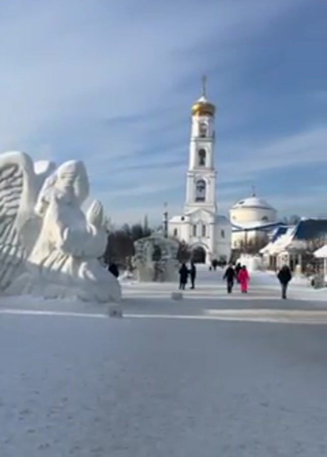 snow-covered area with various ice and snow sculptures, including a large snow sculpture of a praying angel with wings. A white building with a tall bell tower and a gold dome sits in the background. People are walking through the area. There is also an ice sculpture of a pillar topped with snow-covered pine branches. The sky is blue with light clouds.