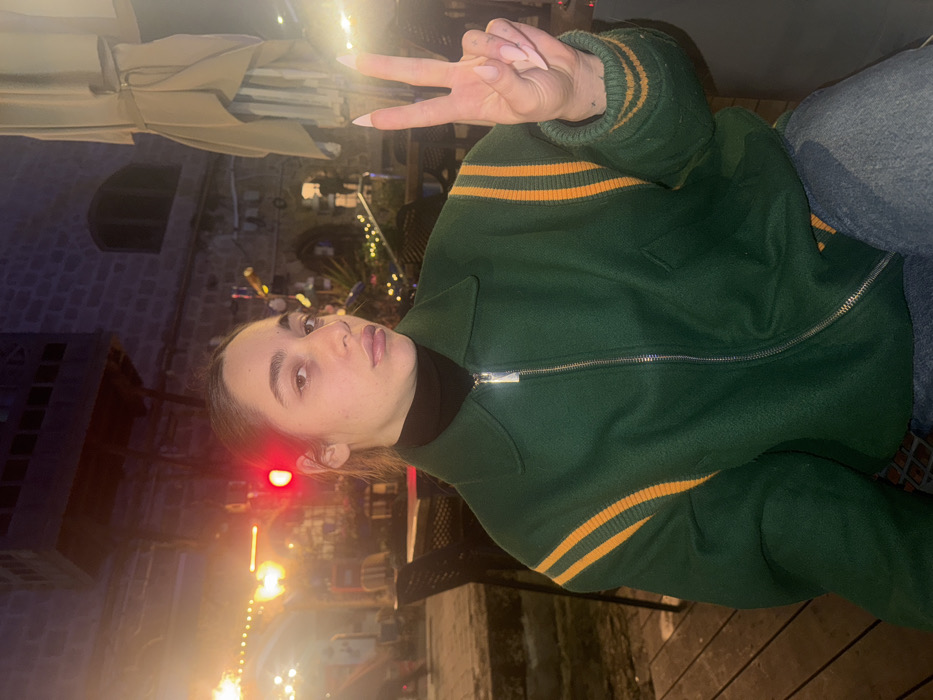 A young woman poses for a photo outdoors at night. She is wearing a zipped-up green bomber jacket with yellow stripes on the sleeves, and a black turtleneck underneath. She holds up a peace sign. The background includes a building with arched windows, string lights, and what appears to be outdoor cafe seating. The lighting is warm and somewhat dim. She is also wearing jeans.