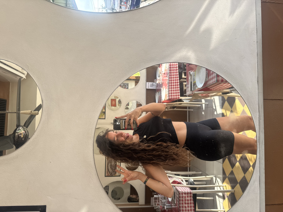 A woman is depicted taking a mirror selfie inside a restaurant, consistent with locations found in Thong Sala, Thailand. She has long, wavy brown hair and is dressed in a black cropped top and black athletic shorts. Her left hand holds a dark-colored smartphone, while her right hand is raised, forming a peace sign. Red nail polish is visible on her fingernails, and she wears a necklace with a circular pendant. Her expression is a smile with her tongue slightly extended. The reflection is captured in a large, irregularly shaped mirror with a textured white frame. The background, reflected within this mirror and several integrated circular mirrors, reveals the restaurant's interior. This includes multiple tables draped with red and white checkered tablecloths, each set with a white plate and glass. The floor exhibits a distinct black and yellow checkerboard pattern. A ceiling fan is reflected in an upper circular mirror. Faint reflections indicate the presence of another individual in a distant mirror and an outdoor street scene with vehicles on the far right.