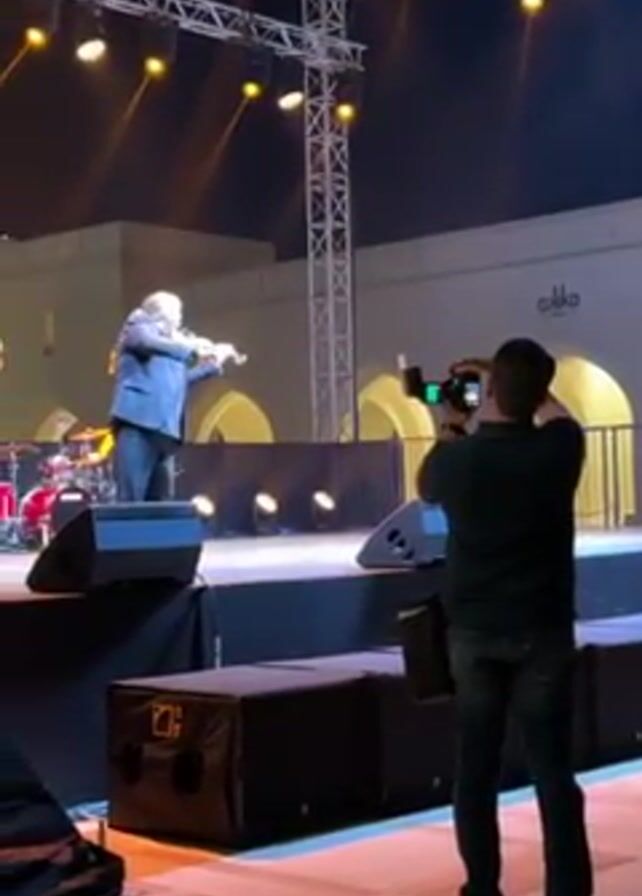 Here's a concise description of the video: The video shows a male violinist performing on a stage, wearing a dark suit. He is playing the violin while facing the audience. Behind him, a screen displays golden arches. A drum set is also visible on stage. In the foreground, a man is filming the performance with a video camera. The stage is illuminated with stage lighting. The environment appears to be an outdoor venue or a large indoor space designed to mimic an outdoor setting.