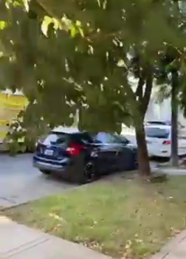 residential street. A fire truck is visible driving down the road. There are several cars parked on the side of the street. Trees line the sidewalk. The video is taken from the perspective of someone standing on the sidewalk.