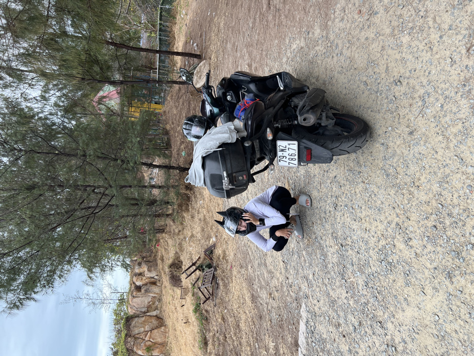 A person wearing a helmet with cat ears is crouched down on gravel near a black motorcycle. The motorcycle has a license plate reading "79-N2 786.71." Behind the person and motorcycle are trees and rocky terrain. The sky is overcast. There is a building visible through the trees in the distance. The overall scene is outdoors.