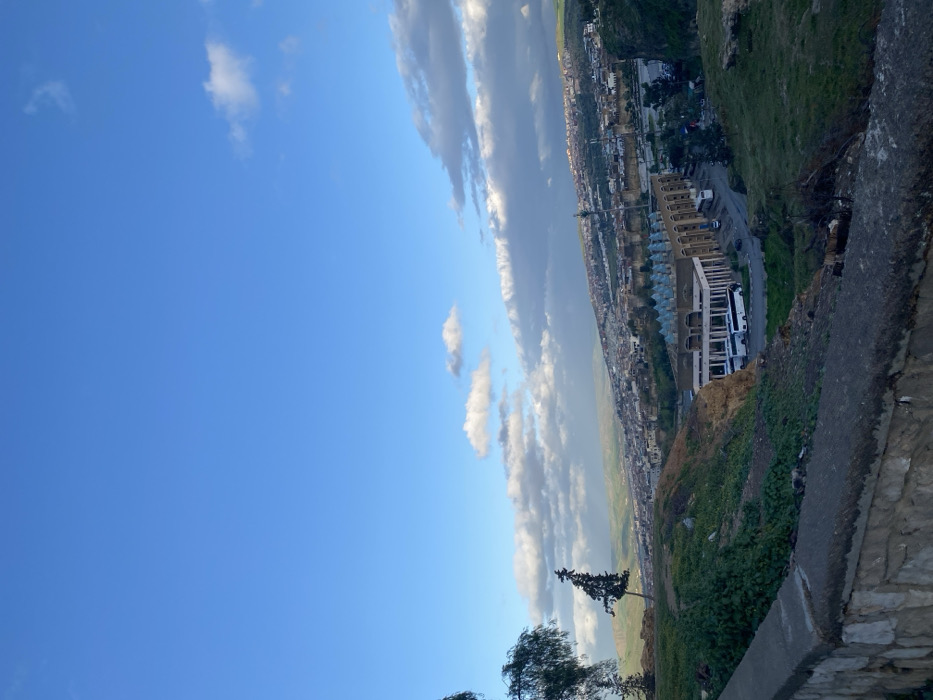 This image presents an elevated, panoramic view of the city of Fez, Morocco, likely captured from a vantage point such as the Borj Nord hillside, overlooking the historic Medina and surrounding areas. The scene is dominated by a clear blue sky with scattered white and grey cumulus clouds, occupying the upper two-thirds of the frame. Below the sky, the distant landscape reveals a sprawling cityscape nestled within rolling green hills and mountains under diffused sunlight. In the immediate foreground, a weathered stone wall with a concrete cap runs horizontally across the bottom of the image, indicating the viewpoint. Below and beyond this wall, the ground slopes steeply, covered in sparse green vegetation, patches of dry earth, and some scattered small trees, including a slender, dark conifer leaning slightly to the left. The midground features a prominent, light-colored building complex with a distinctive multi-sectioned roof composed of numerous light blue, pyramid-shaped or conical structures. Several white tour buses are parked in a paved area directly adjacent to this building. Beyond this complex, a segment of the historic city walls of Fez, characterized by its earthy tone and crenellated design, runs horizontally, separating the foreground from the denser urban core. The city extends far into the background, with countless buildings, visible and indistinct, climbing up and across the undulating terrain. No specific individuals or their actions are discernible within the frame.