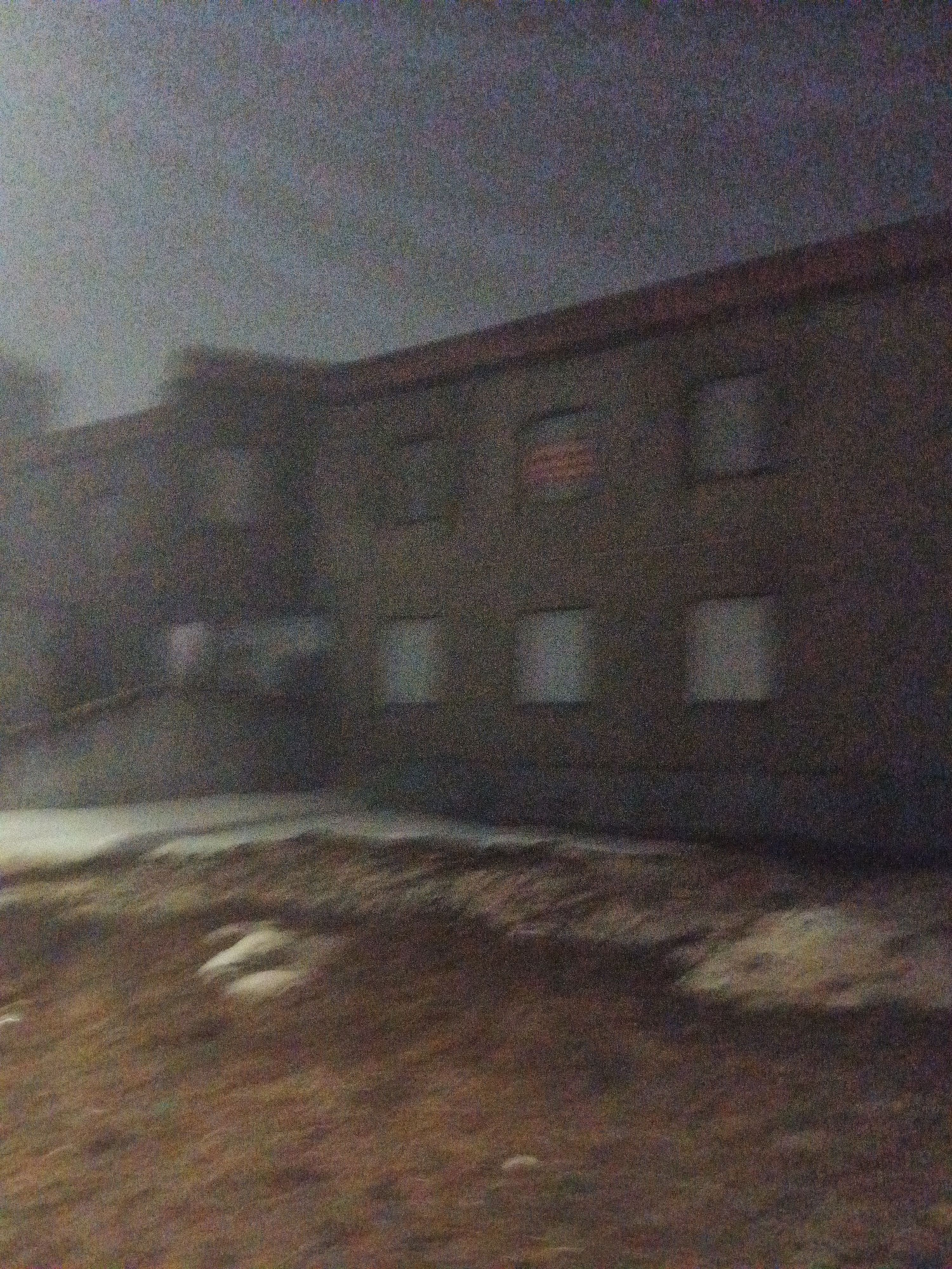 two-story building with boarded-up windows under a cloudy or foggy sky