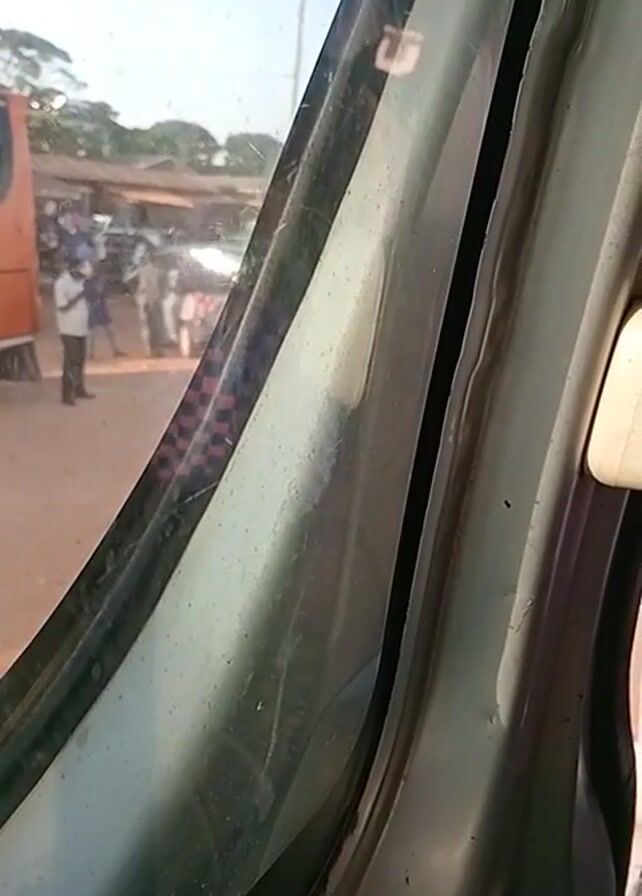 A vehicle is stopped on a dirt road. An orange bus labeled "Coach" is parked nearby. Several people are standing around what appears to be a small white or silver car. The scene is viewed through the passenger window of the car. The day is sunny. There are trees visible in the distance.