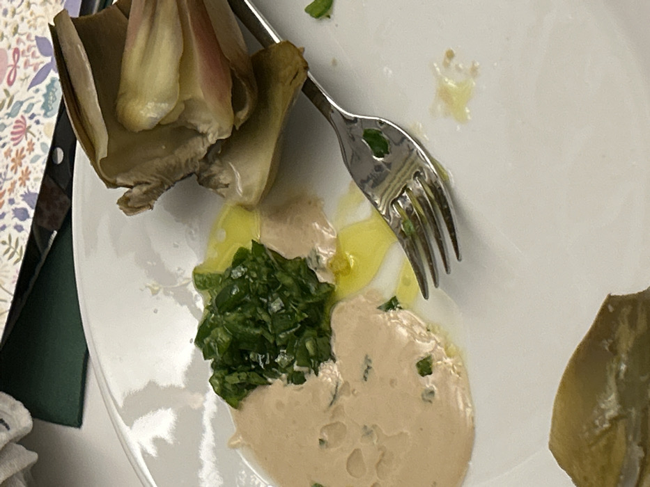 A white plate contains remnants of a partially eaten meal. Two artichoke halves sit on the plate, one attached to the core, the other separate. A silver fork rests amidst the food. There are two sauces: a tan, creamy sauce and a vibrant green chopped herb mixture. A pool of yellow oil is visible, blending with the sauces. Smears and spots of similar sauces appear elsewhere on the plate.