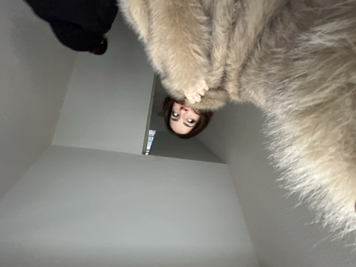 The image depicts an indoor scene from a low-angle perspective. In the foreground, a woman with dark, medium-length hair is visible, wearing a bulky, light brown or beige fur coat with long, shaggy fibers. Her right hand is holding the fur collar near her chin, partially obscuring her mouth and nose. Her left eye is visible, with dark eyeliner, and her gaze is directed upwards and to the right. The pose suggests she is taking a selfie. In the lower right background, a second individual is partially visible from the back, wearing a dark-colored garment, possibly a coat or jacket, with dark hair. The environment consists of plain, light-colored (likely white or off-white) walls and a ceiling, forming simple geometric angles. A faint, vertical rectangular shape, possibly a window or doorway leading to another area, is visible in the distant background on the left. The specific location within the city of Strasbourg, France, cannot be determined from the visual information presented in the image.