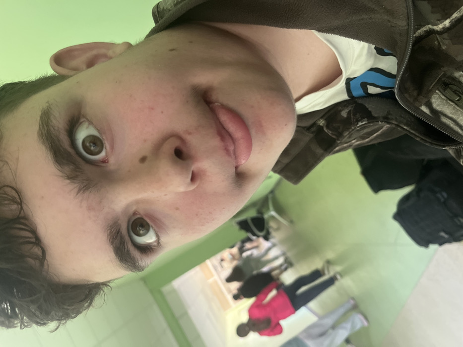 A young male, with light skin, short dark curly hair, and prominent eyebrows, is captured in a close-up selfie, occupying the majority of the frame