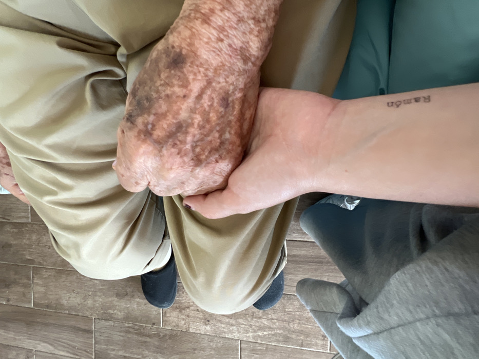 The scene captures an overhead view of two individuals seated indoors on a light brown wooden plank floor. The person on the left wears light gray-blue trousers; their left forearm bears a vertical tattoo reading "Ramón," and their fingernails display dark red polish. This individual's left hand holds the right hand of a second person. The second individual, on the right, wears tan trousers and dark, closed-toe shoes. Their visible right hand presents numerous dark brown age spots and prominent veins. The specific location within Oaxaca City, Mexico, cannot be determined from the visual content.