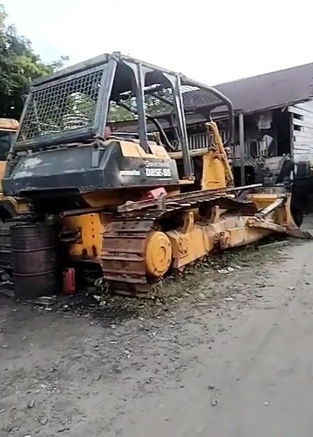 Komatsu D85E-SS bulldozer parked on a dirt and gravel surface