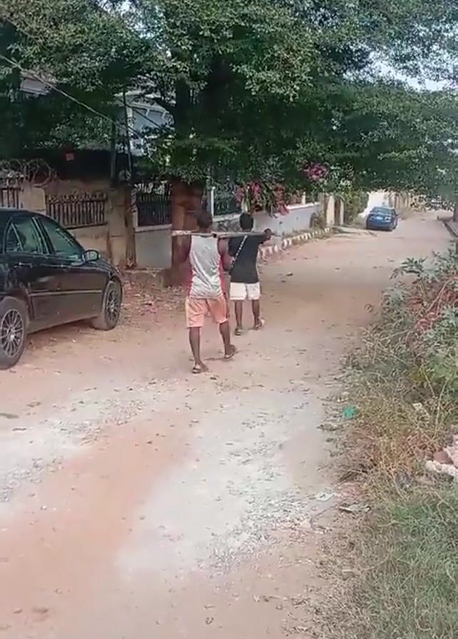 two men walking away from the camera down a sandy, lightly-traveled road in what appears to be a residential area. They are carrying a long wooden pole between them, resting on their shoulders. The man on the left is wearing a white tank top and red shorts, while the man on the right is wearing a black shirt and white shorts. The road is lined with trees and bushes. A black car is parked on the left side of the road. A blue car is parked further up the road on the right. The video is shot from a stationary position.