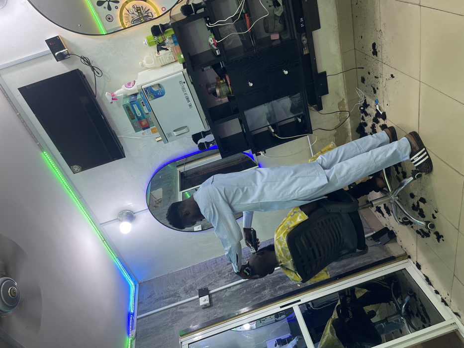 The image depicts the interior of a barbershop in Unguwar Gabas, Nigeria