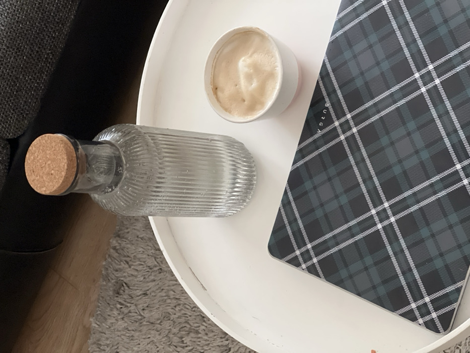 The scene depicts a static domestic interior in Sofia, Bulgaria. A round, white, painted wooden tray with a slightly distressed rim holds three items. On the left, a clear glass bottle, approximately 20-25 cm tall, with vertical fluting and a cork stopper, contains a clear liquid and shows condensation on its outer surface. To its right, a white ceramic cup with a light pink lower half is filled with a frothy, light brown beverage. Below these items, a rectangular object, consistent with a laptop or tablet case, displays a dark green, gray, and white tartan plaid pattern. Partially visible white text spelling "BURGA" is present along one edge of this object. The tray rests on a light gray, shaggy rug. In the background, a dark gray upholstered furniture item and light-colored wooden flooring are visible. No individuals are present.