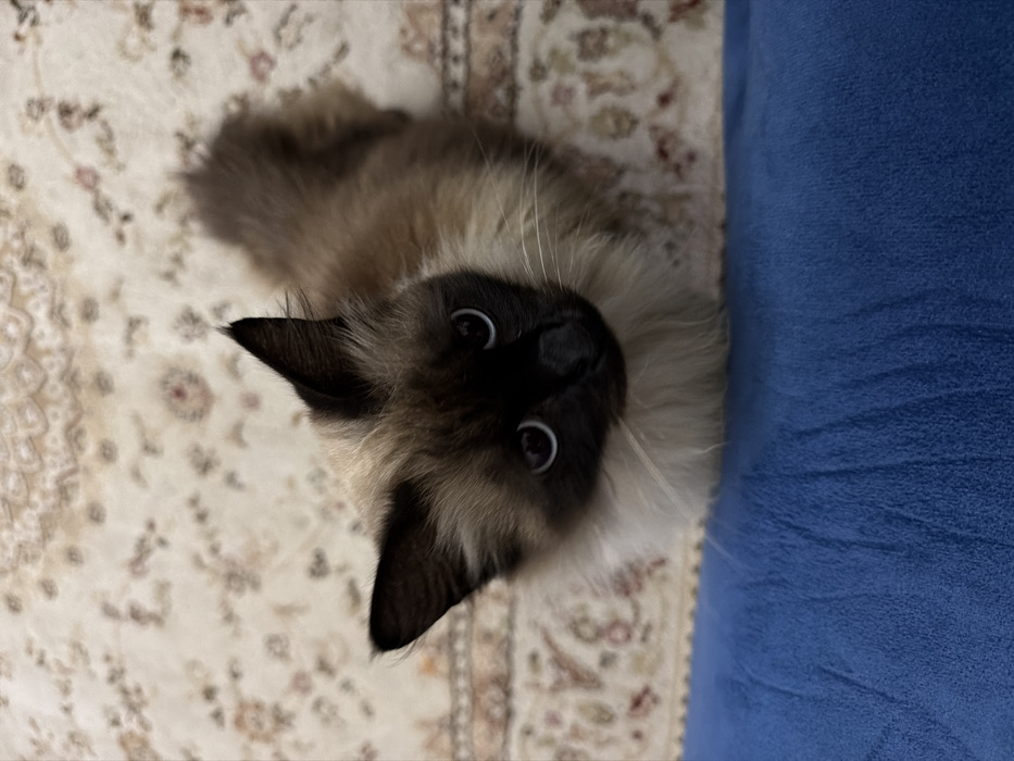 - "A Siamese cat lies on a patterned rug beside a blue couch" by FM-vA9lX2, licensed under CC BY 4.0