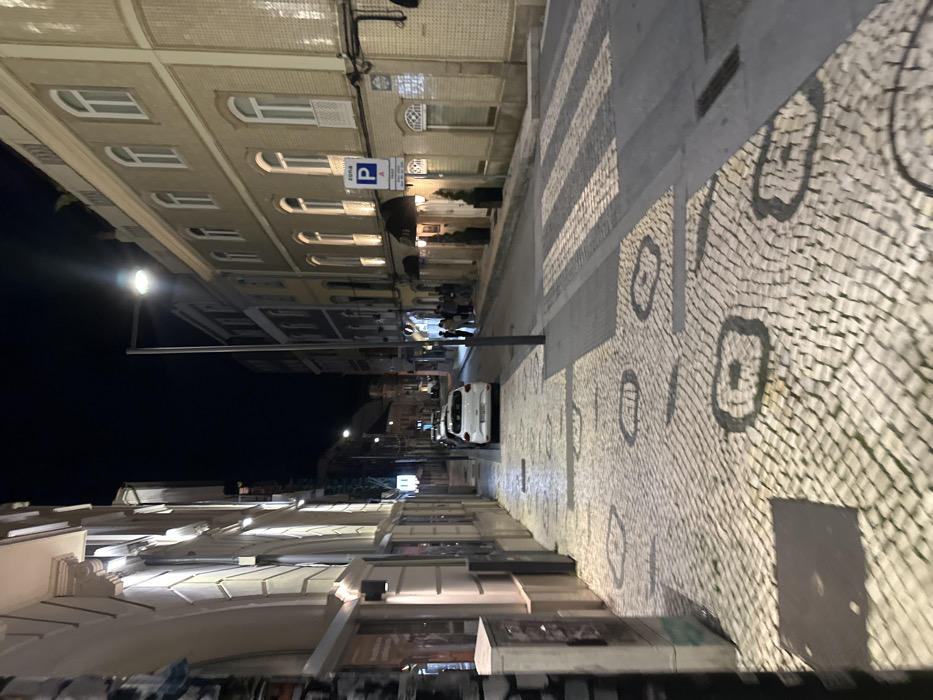 The image captures a nighttime street scene in the city of Aveiro, Portugal. The perspective is a ground-level view looking down a narrow, illuminated urban street. The sky is dark. On the left, a multi-story building with a light-colored, ornate facade is visible, illuminated by upward-facing wall lights. The ground floor features display windows. In the immediate foreground on the far left, a light-colored utility box is present. Further down the street, a white hatchback vehicle is parked facing away from the camera. The pedestrian pavement on the left is composed of light-colored *calçada portuguesa* cobblestones, incorporating darker, concentric ring patterns. On the right side of the street, a multi-story building with a light beige tiled facade and multiple windows with white frames extends along the street. A blue rectangular parking sign, marked "ZONA E" and "PAGO" (paid), is affixed to this building. Below the sign, an entrance is visible with dark awnings and two dark planters each containing a conical evergreen plant. A group of several indistinct individuals is visible on the sidewalk further down this side of the street. A prominent black streetlight pole stands on the right side of the street, near a pedestrian crossing. The street itself transitions from asphalt at the zebra-striped pedestrian crossing in the midground to cobblestone beyond, matching the decorative patterns of the sidewalks. Artificial lighting from streetlights and building facades brightly illuminates the scene. No active vehicle movement or distinct interactions are visible.