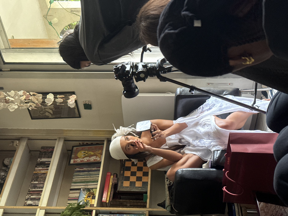A person in a white dress and head covering sits in a black chair, holding a compact mirror and talking. Behind them is a bookshelf filled with books, movies, and decorative items. A camera on a tripod is positioned above the person, suggesting a photoshoot or filming setup. Two people are visible around the camera, likely the photographers or camera operators. A red shopping bag is on the floor next to the chair.