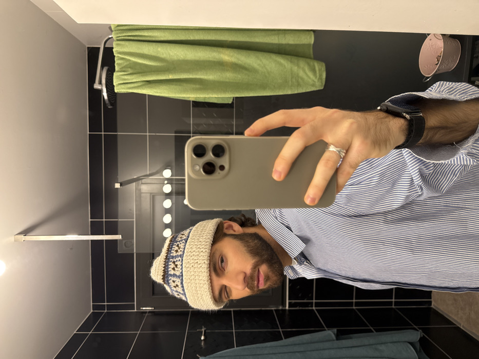 A male individual is depicted in a selfie taken in a bathroom in Chambœuf, France, reflected in a mirror. The man, positioned from the upper chest upward, wears a light-colored knitted beanie with blue and brown patterns, and a blue and white pinstriped collared shirt. He has a beard and mustache, with his left eye partially closed or winking, looking directly into the reflection. His right hand holds a light-colored smartphone with a multi-lens camera array, obscuring part of his lower face and torso. A silver-colored, multi-band ring is visible on his left ring finger, and a dark-colored smartwatch or tracker is on his left wrist, partially covered by his shirt cuff. The bathroom features dark grey or black square wall tiles. A silver-toned showerhead and a bright green towel are visible on the right. To the left, a teal towel hangs. Multiple circular light sources or reflections are present in the mirror behind the subject. A small, light pink bucket is visible on a lower surface to the far right.