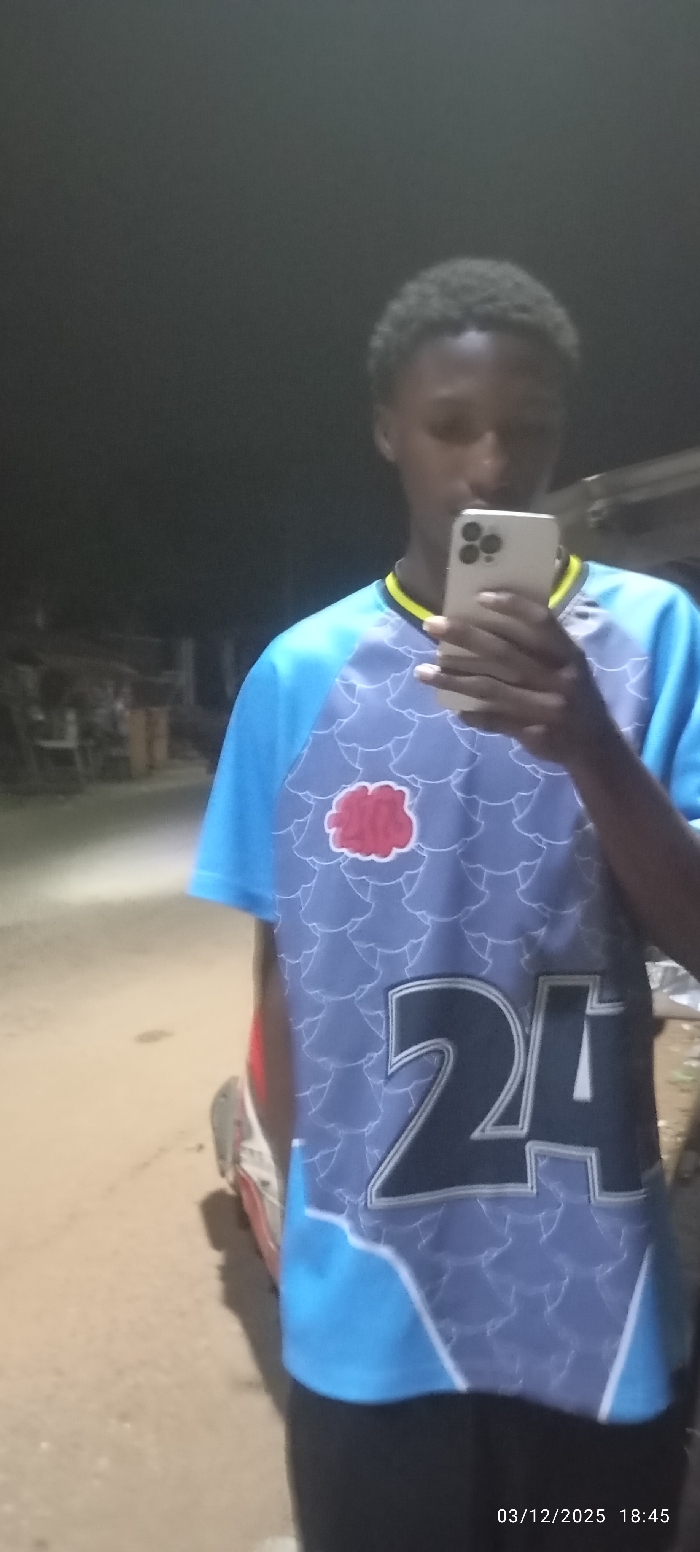 A person holds a smartphone, partially obscuring their face. They wear a blue jersey with a pattern reminiscent of scales, a red emblem, and the number "24". The background is dark, suggesting an outdoor setting at night. A street or path is visible to the side. The image includes a timestamp indicating "03/12/2025".