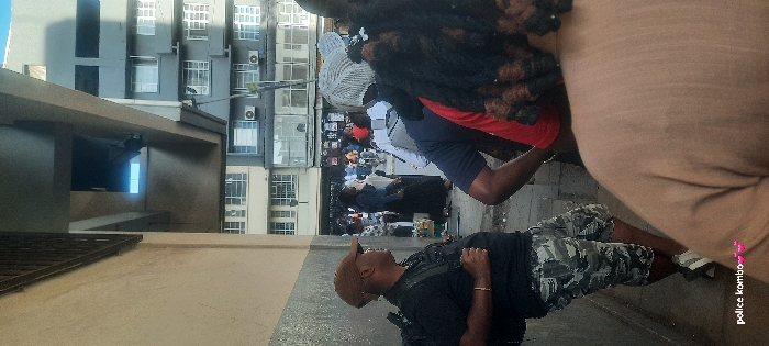 The scene depicts a street-level view in an urban area of Nairobi, Kenya, during daylight hours. In the left mid-ground, a male individual stands facing right, wearing a brown baseball cap, a black t-shirt, camouflage shorts, and white sneakers with dark accents. A black backpack is on his shoulders, and a gold-colored bracelet is visible on his left wrist. He is positioned alongside a light-colored building wall. To his right, partially obscuring the view, are the backs of at least three other individuals. One, in the immediate foreground, has long, dark, braided hair and wears a red shirt. Another, further left, wears a dark blue t-shirt and leans slightly forward. A third, partially visible on the far right, wears a light brown garment. The background reveals a street with dense pedestrian traffic. Individuals are visible in various attire, including one person in a white top and a striped head covering, and another wearing a dark blue denim jacket over a long black skirt. A street vendor's stall, displaying bottled items, is present on the sidewalk. Further down the street, additional pedestrians and motorcycles (boda-bodas) are active. Shopfronts with visible merchandise line the street. Multi-story buildings frame the thoroughfare. A prominent grey building features numerous rectangular windows and visible external air conditioning units. Other structures exhibit various window designs and overhead concrete architectural elements casting shadows onto the lower facades.