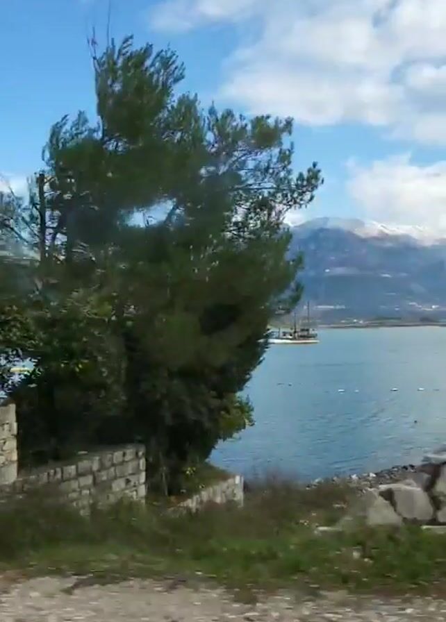 The camera pans quickly across a roadside scene. Initially, we see a low stone wall in the foreground, with green grass and dirt at its base. Behind the wall, there's a body of water with a sailboat in the distance. Snowy mountains are visible in the background, under a blue sky with scattered clouds. A tree partially obscures the view on the left. As the camera moves, a concrete utility pole comes into view, followed by a dense green hedge behind the wall. The view is primarily a moving perspective of a road with surrounding natural elements.