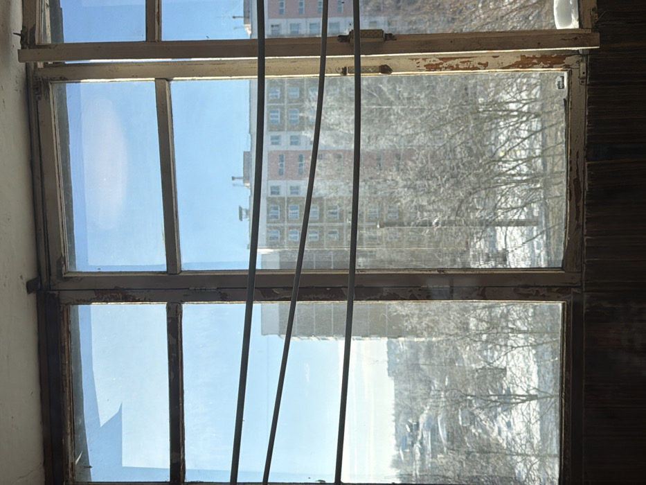 The image displays an exterior view through a multi-paned, weathered wooden window frame. The frame exhibits signs of significant wear, including peeling paint and deteriorated wood, particularly along the vertical and horizontal mullions. Three thin, dark, horizontal rods are positioned in front of the lower two-thirds of the window panes, running parallel to the ground. Beyond the window, under a clear, bright blue sky, an urban winter landscape in the city of Kushlyanshchina, Russia, is visible. In the mid-ground, a prominent multi-story residential building stands, characterized by its light-colored facade with a central reddish-brown section. Several other similar apartment blocks are discernible further in the background. The ground is uniformly covered in snow, and numerous bare deciduous trees and shrubs, indicative of winter, are scattered throughout the landscape, many appearing lightly frosted. No individuals or specific actions are depicted within the scene. The overall environment suggests a cold, clear day in a residential area.