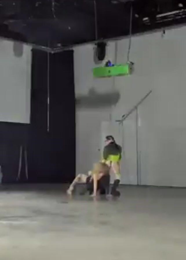 n art performance in an open studio-like space with concrete floors and high ceilings. Two performers are on the ground moving dramatically, kicking up dust. One performer wears a bright yellow outfit with the other appearing in dark clothing. A small audience sits along the sides of the space, watching the performance. A camera crew records the event, evident by the boom mic and other equipment present. Projectors and other equipment hang from the ceiling.