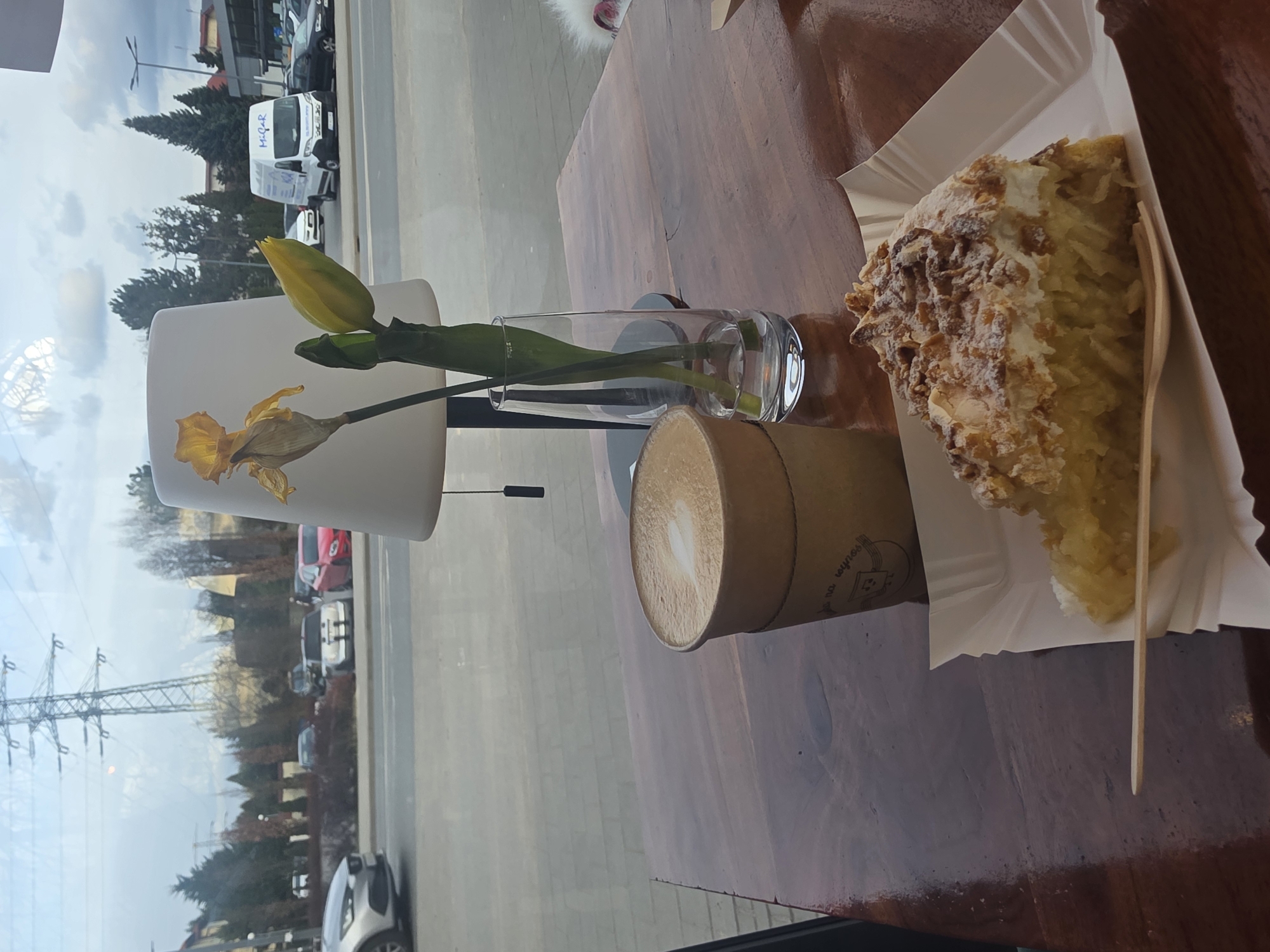 The scene depicts an interior view from a cafe or similar establishment in Wrocław, Poland, specifically located in the vicinity of Krakowska 179A, as indicated by the distinctive presence of a white "MiQOR" delivery van visible through the window, alongside prominent electrical transmission pylons in the background. In the immediate foreground, on a dark wooden table, a kraft paper cup filled with cappuccino, featuring a heart-shaped latte art, is positioned. Adjacent to it, a clear glass vase contains a single yellow, slightly wilted daffodil and a yellow tulip bud. Behind the floral arrangement, a small white lamp with a conical shade is partially visible. To the lower right, a slice of apple cake, topped with a creamy layer, toasted nut flakes, and powdered sugar, rests on a white paper plate, accompanied by a small wooden utensil. The outdoor environment visible through the large window under an overcast sky includes a paved road with vehicles. A silver sedan is partially observed on the left, moving or parked close to the window. On the opposite side of the road, several parked cars are visible, including a silver sedan and a red sedan, with the "MiQOR" branded white delivery van parked further along. A treeline and distant buildings complete the urban landscape, with the large metal structure of an electrical transmission pylon standing prominently against the sky.