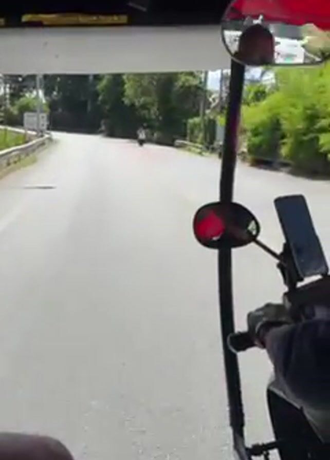A vehicle travels along a paved road, recorded from the passenger seat of an auto rickshaw or similar three-wheeled vehicle. The road has a red-painted area near the edge. There are trees and vegetation along both sides of the road. A white SUV is parked to the right, and other vehicles, including motorcycles and a pickup truck, are seen in the distance. The driver of the rickshaw is visible in the foreground. A smartphone is mounted to the handlebars, likely being used for navigation.