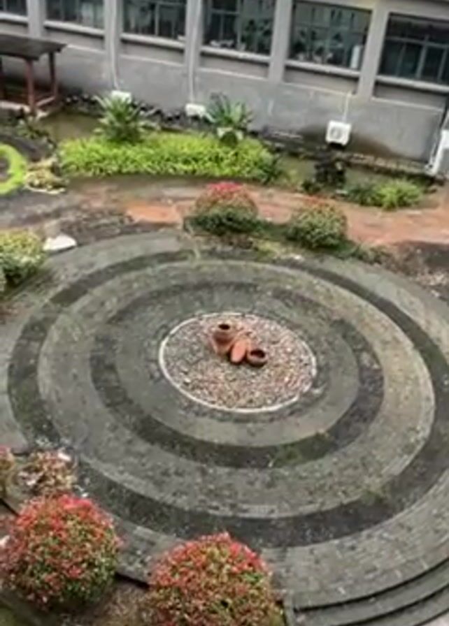 circular courtyard surrounded by a multi-story building. The courtyard is wet, indicating recent rainfall. The central feature of the courtyard is a circular design made of concentric rings of dark and light-colored stones, with a small pile of brown pots in the very center, surrounded by small pebbles. Around this circular design are bushes with red foliage and patches of green grass and other plants. In the background, there's a covered walkway and other landscaping elements, with the building having multiple windows, some with visible air conditioning units. The video is taken from an elevated position, likely from a balcony or window in the building.