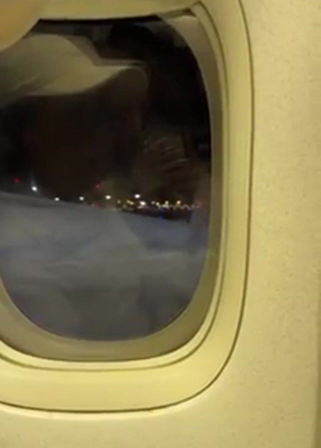 A person's face is reflected in an airplane window. Outside the window there is a snow covered ground with blurred lights visible on the horizon.