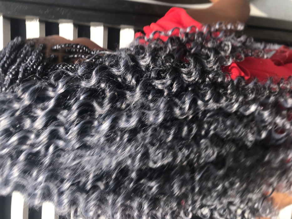 A close-up, high-angle image in Langbasa, Nigeria, depicts the back and partial right profile of an individual. The subject's head is adorned with voluminous, dark grey and black synthetic hair extensions styled in tight, cascading curls. Smaller, dark box braids are visible on the right side of the scalp, transitioning into the curly mass. A portion of a bright red garment is visible beneath the hair on the right side of the frame. The background is out of focus, showing bright sunlight illuminating a dark vertical structure on the right and a horizontally slatted, light-colored object to the left, likely part of a building or fence. The scene is static, with no discernible actions or interactions.