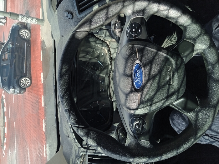 The image provides a first-person view from the driver's seat of a Ford vehicle, likely in Casablanca, Morocco, given the distinctive red-paved road often used for public transport lanes. The driver's legs, wearing blue jeans, are visible beneath a black Ford steering wheel, which features a blue Ford emblem, "AIRBAG" text, and control buttons on its spokes. A prominent grid-like shadow, indicative of sunlight passing through a patterned screen or window tint, is cast over the steering wheel and dashboard. Outside the vehicle, a black compact SUV, possibly a Renault Clio, is visible on the red-paved road, facing left. A human arm is seen extending from the open driver's side window of the SUV. White dashed lines delineate the red road section. To the right, a utility pole with black and white stripes stands by the roadside. The overall environment suggests a sunny daytime setting, possibly in a roundabout or curved street segment.
