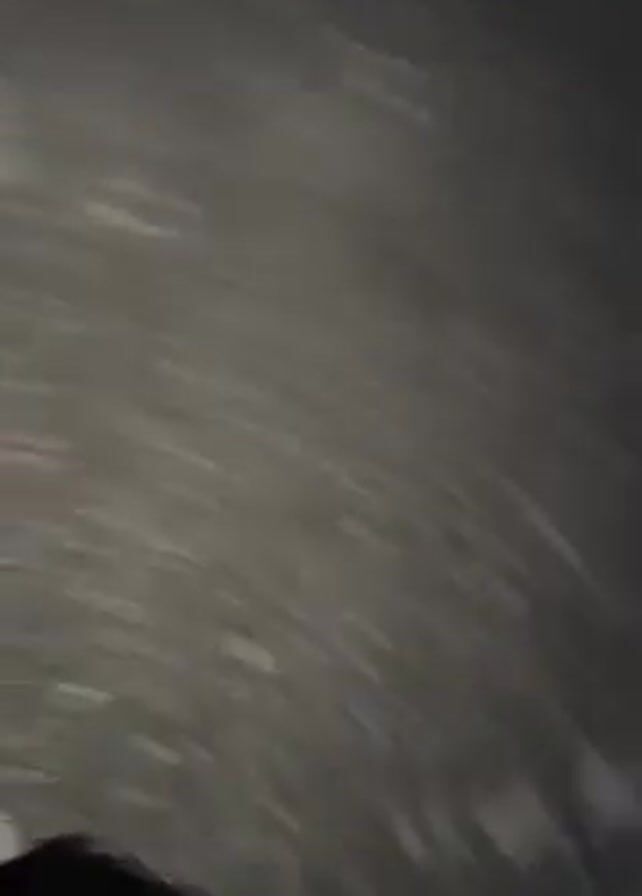 A young woman is seen in an outdoor setting. The camera is initially pointed downwards, showing the ground which appears to be a rough, stony surface. The woman's feet are visible, clad in pink sneakers and dark trousers. The camera is then quickly raised, focusing on the woman's face. She is smiling and has long blonde hair that is being blown by the wind. The background shows a horizon with what appears to be a body of water or snow in the distance and a dark, possibly mountainous landmass. The sky is transitioning from dark blue to lighter shades of pink and orange, suggesting it is either dawn or dusk. The woman is wearing a black jacket with white trim. The overall scene suggests she is enjoying a natural landscape, possibly at the edge of a lake or a snowy area.