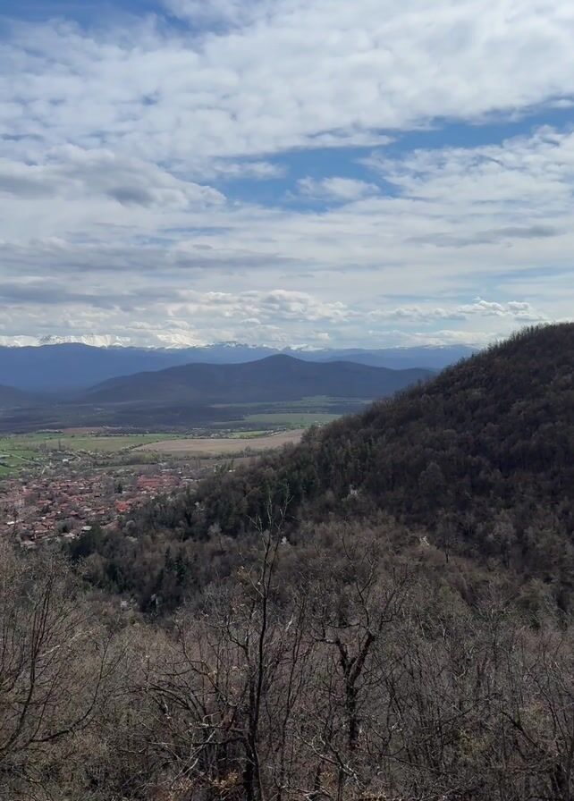 The camera pans slowly across a scenic landscape, featuring a town nestled in a valley surrounded by green fields. In the background, snow-capped mountain peaks stretch across the horizon under a blue sky dotted with white clouds. In the foreground, a hillside covered with bare trees slopes down towards the town, providing a vantage point for the view. The scene conveys a sense of tranquility and natural beauty.