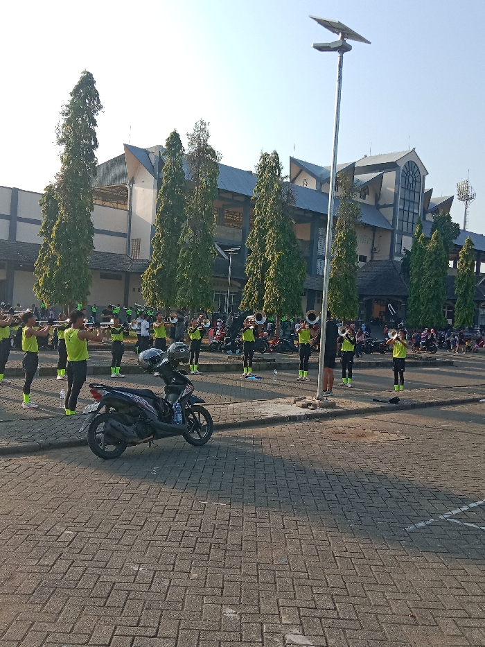 The image depicts an outdoor rehearsal session for a musical ensemble on a paved surface in Kendal, Indonesia
