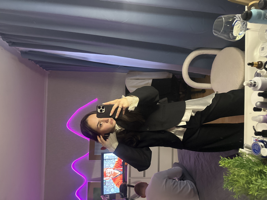 The image depicts an indoor scene in Nekrasovskiy, Russia, captured as a mirror selfie. A female subject, with long dark hair, stands centrally, holding a dark-colored smartphone in her right hand to photograph her reflection. She wears a black blazer over a white blouse featuring ruffled cuffs and a high collar, paired with black wide-leg trousers. A ring is visible on her left ring finger. In the reflected background, a male individual is seated on a bed with dark grey bedding, facing away from the camera. He wears a light-colored long-sleeved shirt and grey pants. A television screen is visible behind him, displaying an image of a man in an orange hockey jersey and helmet. Above the television, a wavy pink neon light strip is affixed to the light grey, textured wall. Light blue curtains hang on the right side of the reflected scene. To the right of the female subject, a white, looped-back furry chair is positioned. The foreground, at the base of the mirror, shows a vanity surface cluttered with various cosmetic products, bottles, and a small green potted plant. A clear wine glass containing liquid and a blue bottle are also present on this surface.