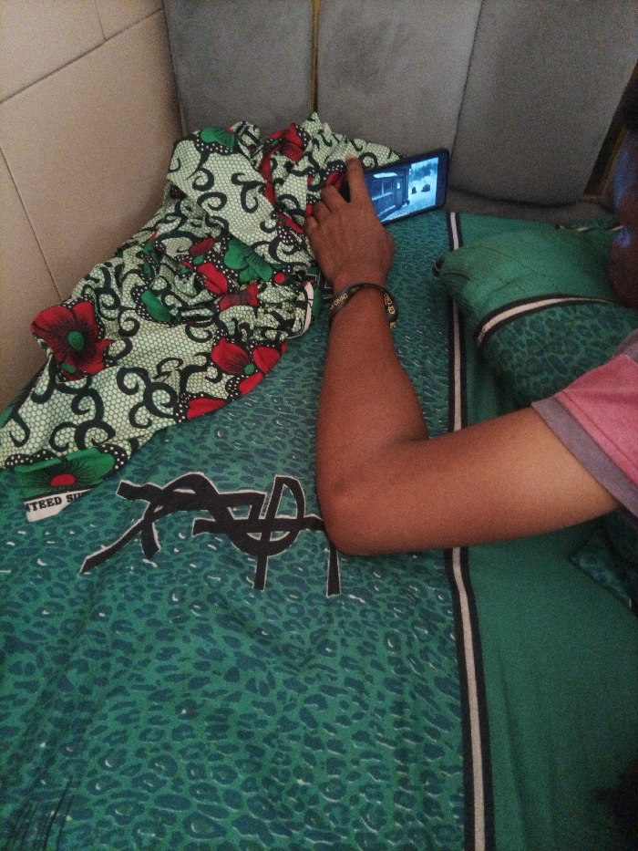 The image depicts an indoor scene where one individual is reclining or lying down, engaged with a smartphone. The specific location within the city of Unknown, Unknown, is not discernible, but it appears to be a domestic or leisure setting. **People:** One person is visible, primarily their right arm, hand, and a portion of their upper torso and head. The individual has a medium-brown skin tone. They are wearing a pink garment with a grey trim on the visible shoulder and a black wristband with light text on their right wrist. The person's right arm is bent at the elbow, and their right hand is holding a black smartphone horizontally. **Subjects/Objects:** The person is holding a black smartphone with a screen displaying what appears to be an interior room with a window, possibly depicting a snowy exterior or a stylized scene. To the left of the person's arm and phone, a crumpled piece of fabric or clothing is present, featuring a vibrant pattern of red flowers, green leaves, and black swirls on a light green background with a subtle white lace-like overlay. The surface the person is resting on is covered by a teal or dark green patterned sheet or throw, displaying a leopard print design and a large black stylized logo, potentially "YSL". A white label or text fragment reading "NTEED SUF" is partially visible on this fabric. A dark green pillow with a white and black striped edge is positioned under the person's upper body. **Environment:** The background consists of two padded sections upholstered in a light grey or beige fabric, suggestive of a headboard, sofa back, or wall panels. The lighting in the scene is ambient.